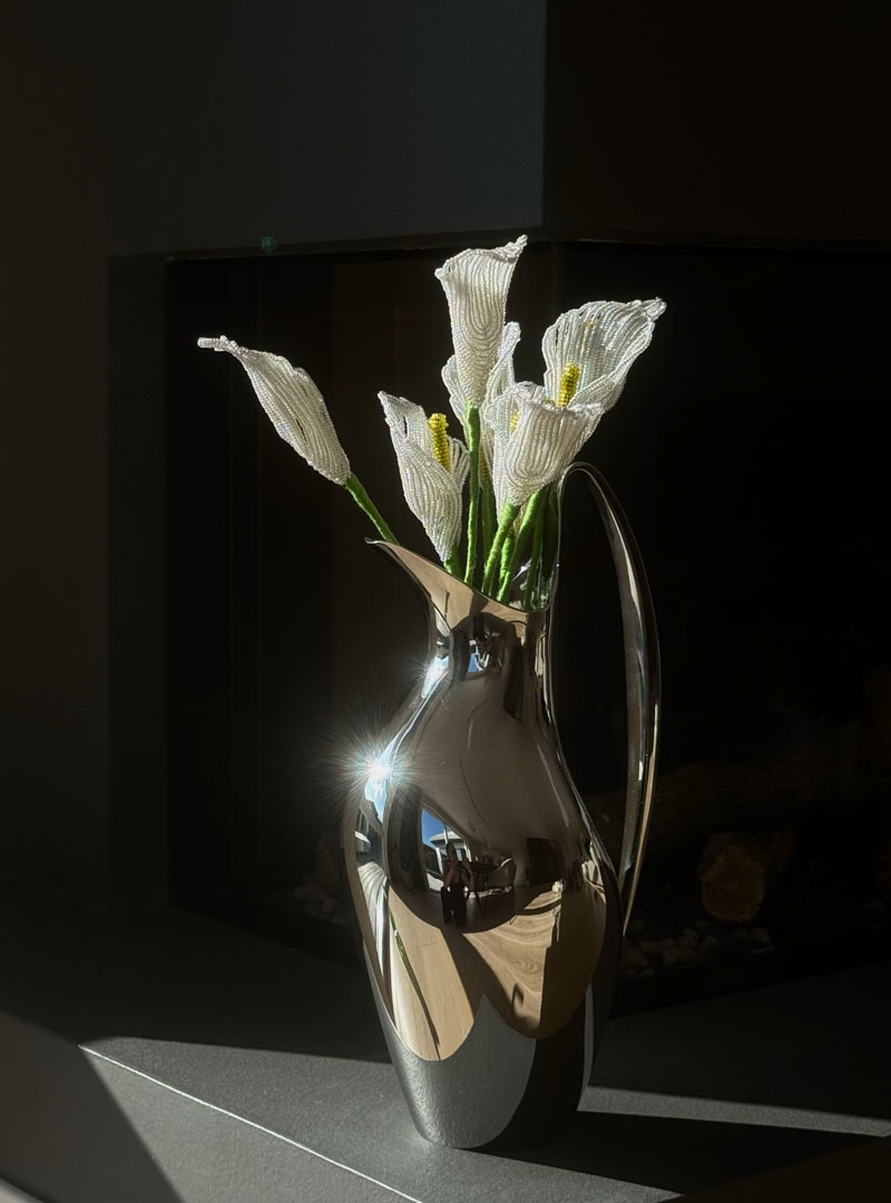 Denne buket kommer med otte hvide calla liljer i fine hvide perler, med gul støvdrager. Alle blomster er lavet med glasperler og håndlavet af evïg.